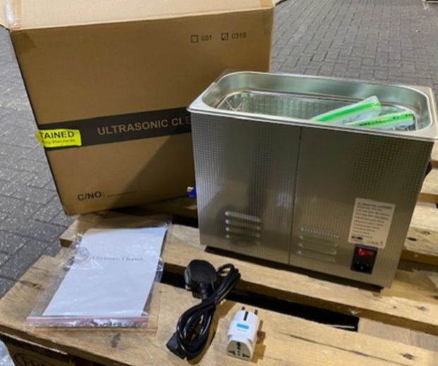 Silver Vevor-branded bath-shaped cleaning appliance for use in laboratory setting, supplied with instructions manual, black power supply lead and white travel adaptor.