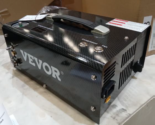 A black air compressor for use with a portable PCP gun.