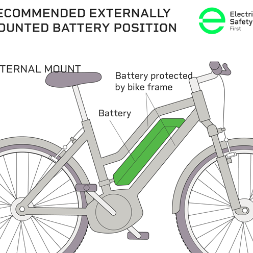 The basic bicycle frame design has remained essentially unchanged for over a hundred years and most current e-bikes have adopted this well proven design. The main design considerations in relation to an e-bike can therefore be centred around electrical safety. The battery requires impact protection, and the bike frame can be utilised to minimise risk of damage from impact. Therefore, mounting the battery centrally on the frame, in conjunction with a properly designed enclosure, or integrating the battery into the frame can be considered as a means of achieving protection against mechanical impact.