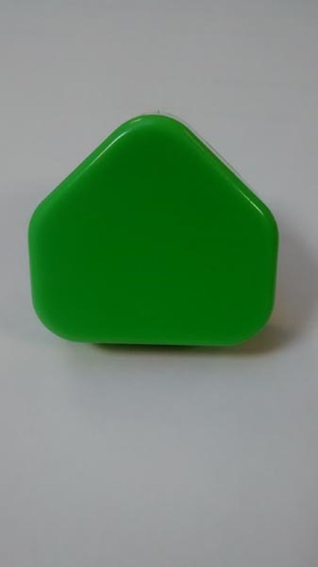 Green and white triangular AC/DC adaptor with 3 pins and a USB output.