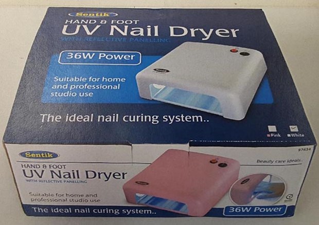 UV Nail Dryer, in either pink or white plastic, supplied in a cardboard box. See images for details.