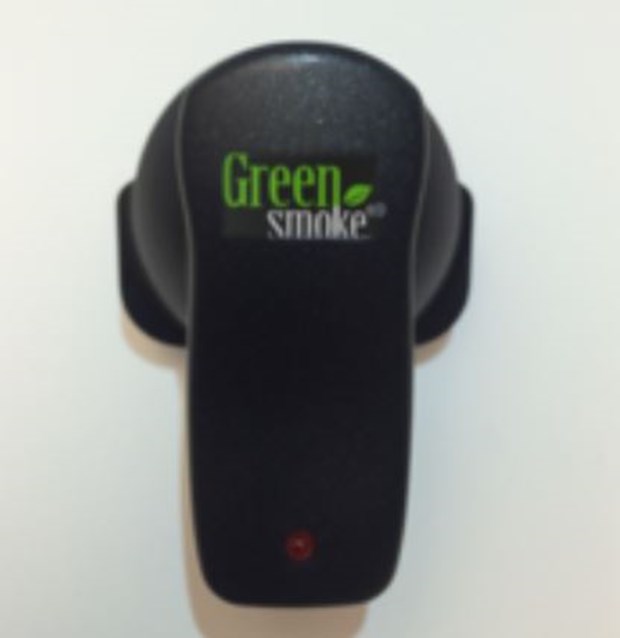 Black wall adapter with a green and white Green Smoke logo. Product has a label identifying the Model as JD-050-050 and identifying the Output as DC 5V 500mA .