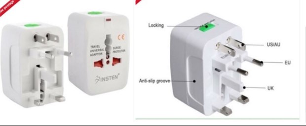 White international travel adaptor with red shuttering and green lock. Packaging unknown. The design of the product allows multiple adaptor pins to be open at once. If in use, live parts are accessible presenting a serious risk of electric shock.