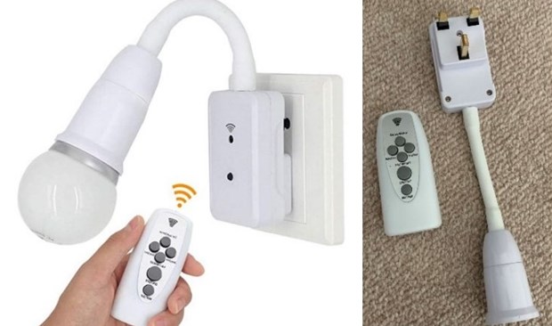 A light fitting with a UK plug which is connected, via a flexible neck, to a E27 (screw fitting) LED lampholder. The lamp is operated by a remote control and is dimmable.