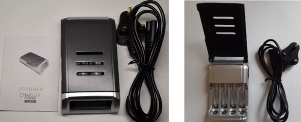 Black and silver 4 slot battery charger with cable and 3 pin mains plug.