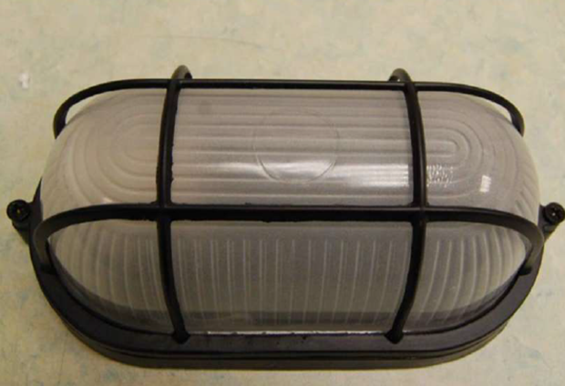 Mains powered bulkhead lamp, fitted with tails connection to the mains supplied in brown cardboard packaging.