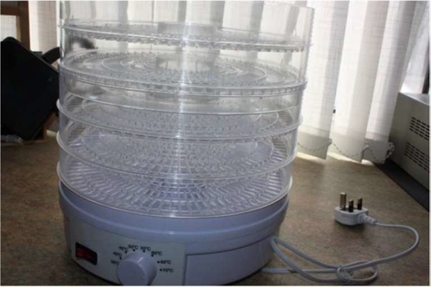 Food Dehydrator with changeable temperature gauge, as well as an attached power plug.