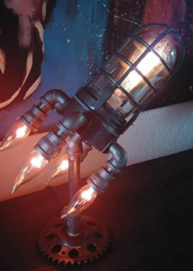 Table lamp in the shape of a rocket with plastic outer shell, metal stand and black power supply cord.