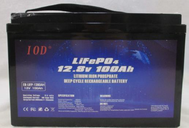 Two versions of 12V 100Ah lithium deep cycle battery, one with a yellow label and one with a blue label. Both with identical markings and labelling apart from the background of the label.