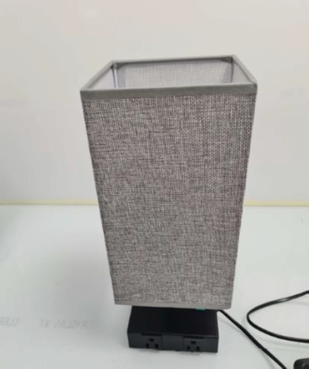 Rectangular table desk lamp, with grey fabric lamp shade and black square base. 2 USB ports are located on the base of the lamp.