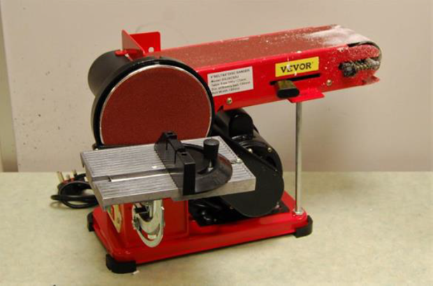 Red mains powered metal bodied electric sander incorporating belt and disc attachments, fitted with a supply cord and fused plug.