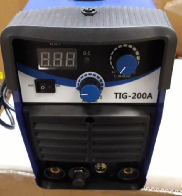 Blue metal bodied MIG welder marked with the brand ‘Vevor’ supplied in plain cardboard packaging with an image of the product on the face. Supplied with noncompliant Personal Protective Equipment (PPE) safety glasses.