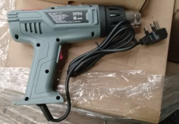 Green hand-held heat gun with black power supply cord, supplied in brown cardboard packaging.