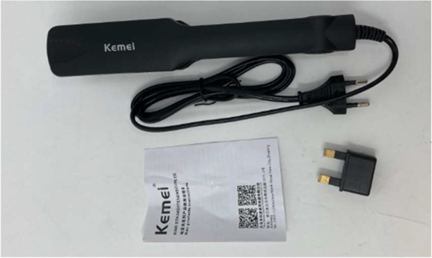 Black hair straightener with black power supply cord and 2-pin plug, supplied with separate travel adaptor.