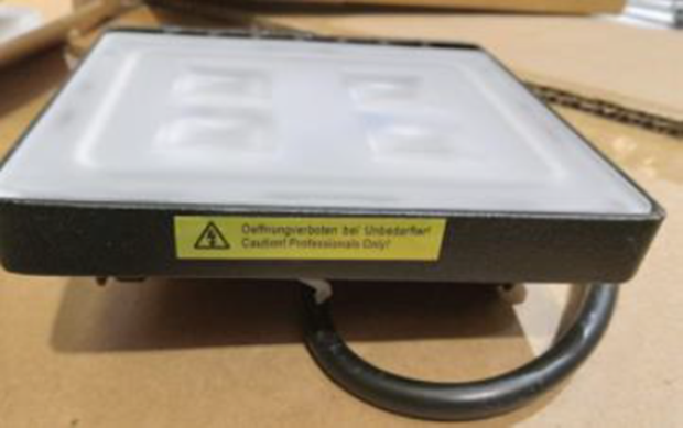 Square LED Floodlight luminaire (20W) with wiring for wall installation, supplied in brown cardboard packaging.