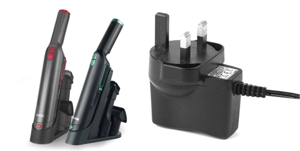 A black 3-pin DC adaptor supplied with Beldray and Salter cordless vacuums.