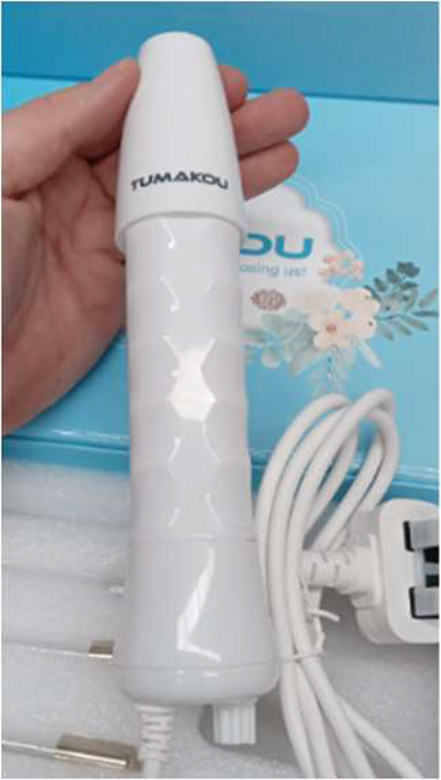 A white glass high frequency beauty device in light blue cardboard packaging.