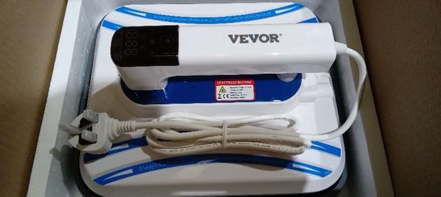 Heat press machine for fabric printing. The product is a white machine with blue panelling.
