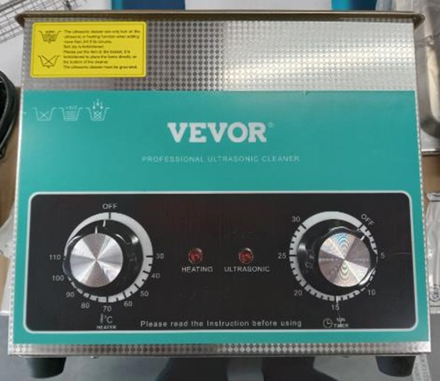 Silver and turquoise ultrasonic jewellery cleaner with brand “Vevor” printed on.