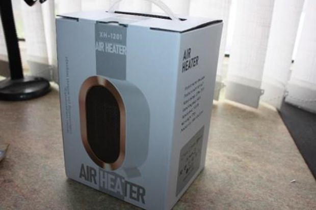 White oval-shared fan heater with gold rim and black grating, supplied with black power supply cord and three-pin plug in white cardboard packaging.
