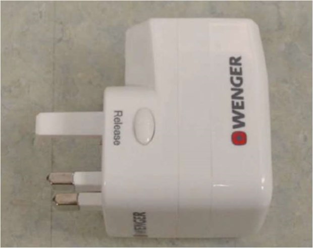 Two styles of Wenger white travel adapters. One three-piece set, and the other a USB version.