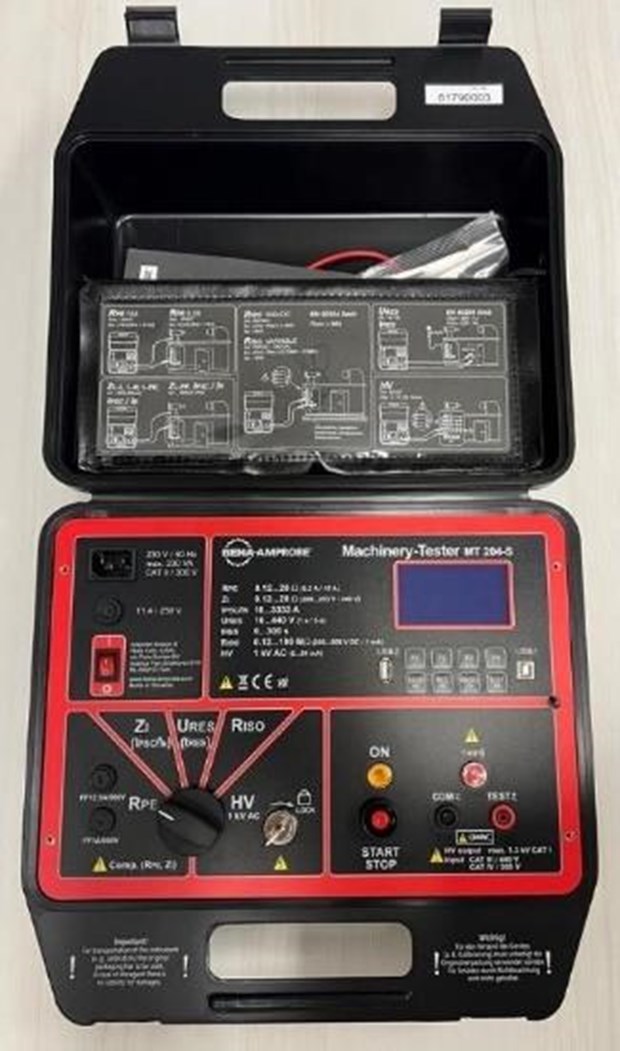 The product is a machinery tester supplied with a set of unshrouded test leads that does not require two-hand operation. The leads are used to interconnect the Machinery Tester to an electrical machine for (high voltage) measurement purposes.