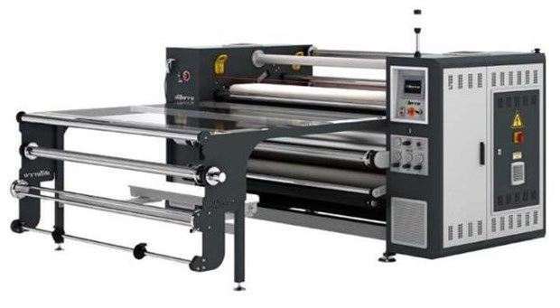 An industrial sublimation calender press used to transfer designs onto fabrics or other materials. The press has an oil-filled heated drum (roller), which is used to apply pressure and heat to transfer the designs. A weekly programming function allows the user to pre-heat the machine to a set temperature at a specific date and time.