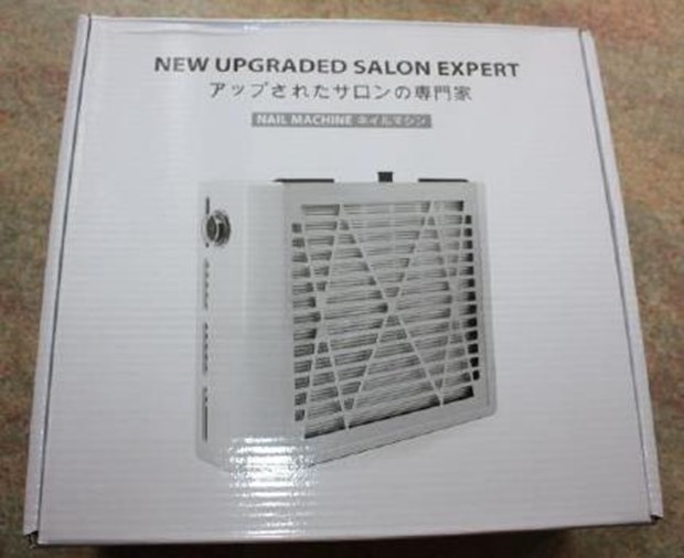 A pink, square shaped nail dust collector with a silver grill on the top.
