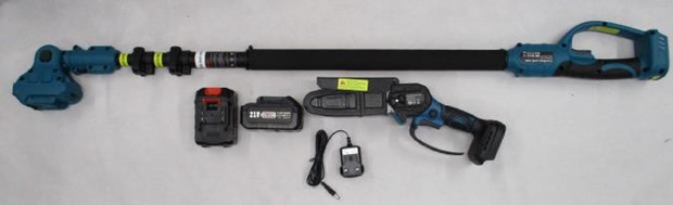 Blue and black pole saw and chainsaw powered by lithium-ion batteries. Supplied with battery charger and power cable.