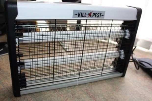 A white and black electric UV heater lamp that attracts and kills mosquitos.